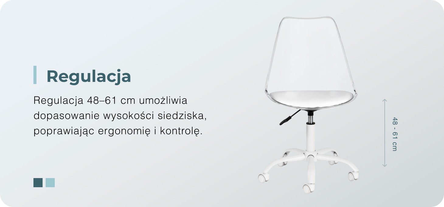 Regulacja w zakresie 48–61 centymetrów pozwala ustawić siedzisko na wysokości wspierającej ergonomię i precyzję, co przekłada się na większą kontrolę podczas pracy. Mechanizm pełnego obrotu zapewnia swobodne manewrowanie i sprawia, że praca staje się bardziej efektywna i wygodna. Ergonomiczny kształt siedziska wspiera komfortowe ułożenie ciała, zapewniając wygodę nawet podczas dłuższej pracy.
