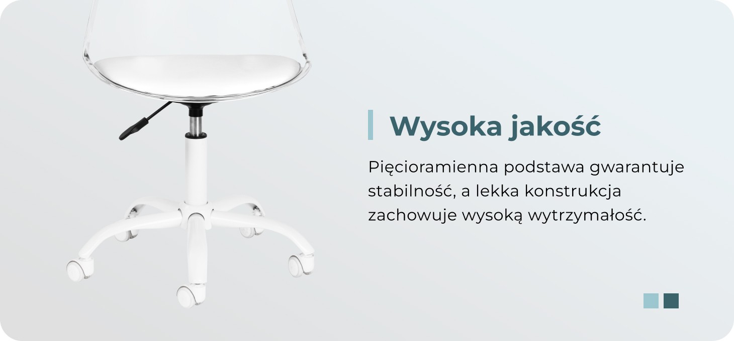 Pięcioramienna podstawa zapewnia pewne oparcie oraz stabilność podczas pracy, a kółka ułatwiają płynne i wygodne przemieszczanie się po gabinecie. Krzesło sprawdzi się doskonale przy różnych stanowiskach pracy. Mimo lekkiej konstrukcji krzesło pozostaje wytrzymałe, co przekłada się na niezawodne, komfortowe użytkowanie.