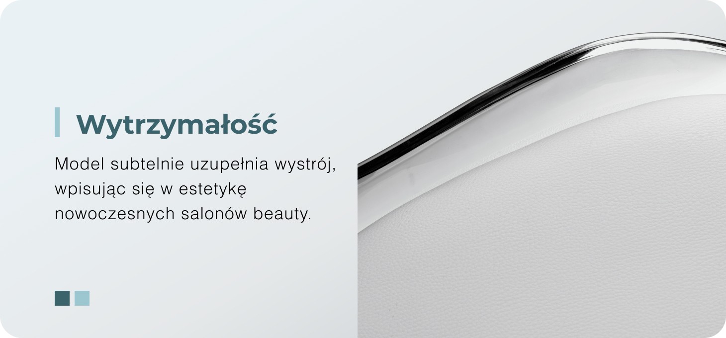 Model przyciąga uwagę efektownym, transparentnym oparciem, nadającym całości lekkości i nowoczesnego charakteru. Połączenie przejrzystej konstrukcji z tapicerowaną białą skórą syntetyczną poduszką siedziska oraz białą podstawą tworzy wyrafinowany kontrast podkreślający elegancję. Dzięki temu krzesło staje się nie tylko funkcjonalnym elementem wyposażenia, lecz także stylową ozdobą gabinetu. Świetnie komponuje się z każdym wnętrzem, doskonale wpisując się w estetykę współczesnych salonów beauty.