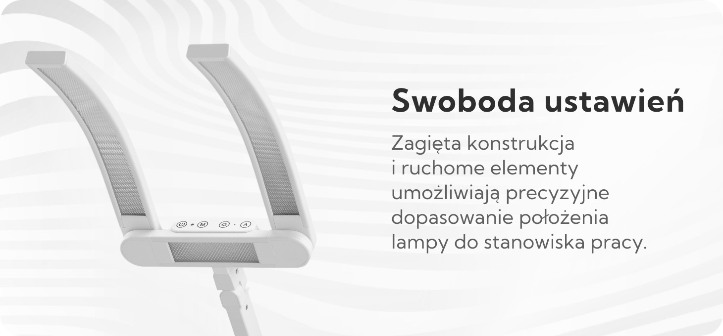 Charakterystyczną cechą lampy jest głowica z zagiętymi ramionami, poruszającymi się horyzontalnie w zakresie 215°, która łączy nowoczesny, intrygujący design z wysoką funkcjonalnością. Profil wypełniony taśmą LED zapewnia równomierne, bezcieniowe doświetlenie obszaru zabiegowego, zwiększając komfort wykonywania usług oraz ułatwiając dopasowanie ustawień do indywidualnych potrzeb. Strukturalna powierzchnia panelu skutecznie rozprasza światło, dzięki czemu lampa nie razi w oczy. Dodatkowo obrotowa głowica o szerokim zakresie ruchu pozwala na precyzyjne ustawienie oświetlenia zgodnie z preferencjami użytkownika oraz charakterem wykonywanej usługi.