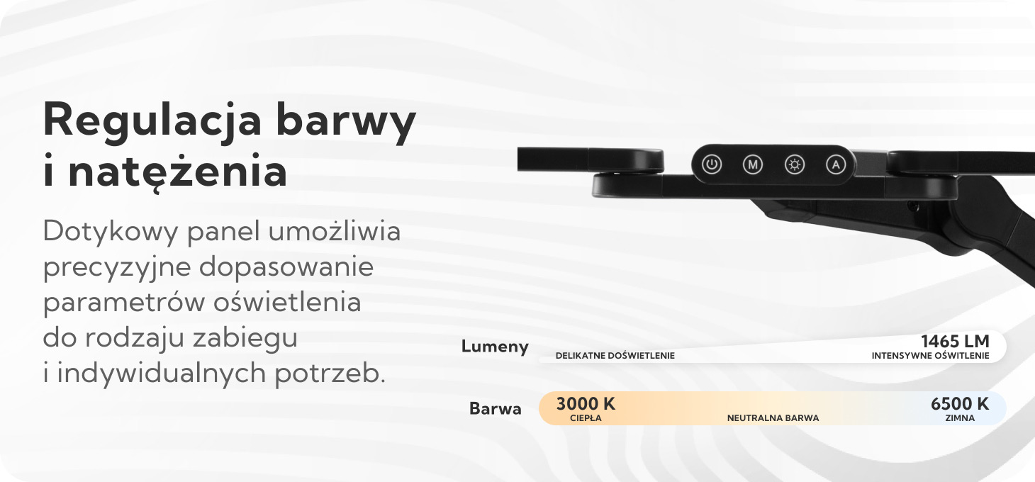 Możliwość dostosowywania barwy i natężenia światła zapewnia doskonałe odwzorowanie widzianych barw, co redukuje zmęczenie oczu podczas długotrwałej pracy. Barwę oraz natężenie światła można stopniowo dostosowywać przy użyciu dotykowego panelu umieszczonego na głowicy. Regulacja obejmuje pięć poziomów temperatury barwowej (od zimnej, przez neutralną, po ciepłą) oraz pięć poziomów natężenia światła. Po dłuższym przytrzymaniu przycisków możliwe jest również bezstopniowe regulowanie, co daje ogromne możliwości dostosowywania oświetlenia do indywidualnych potrzeb. Lampa została także wyposażona w czujnik światła, umożliwiający automatyczne dostosowanie intensywności oświetlenia do jasności otoczenia, co dodatkowo zwiększa komfort pracy.