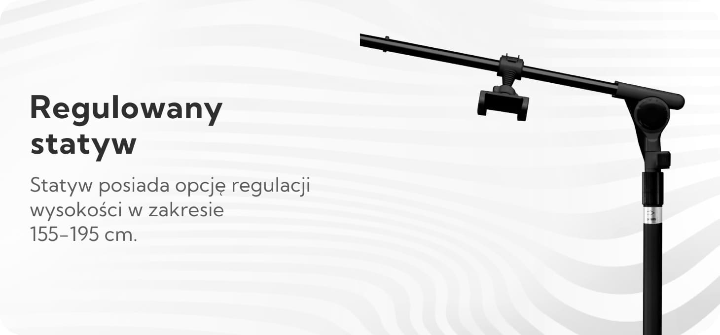 W zestawie: lampa, elementy statywu, podstawa, uchwyt do telefonu, pilot bezprzewodowy, zasilacz i przewód zasilający, instrukcja.