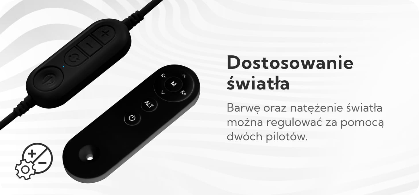 Statyw można w łatwy sposób regulować w zakresie 155-195 cm przy pomocy blokującej śruby umieszczonej na ramieniu. Umożliwia to precyzyjne dopasowanie pozycji głowicy do indywidualnych potrzeb użytkownika oraz różnych typów foteli kosmetycznych, leżanek i stołów zabiegowych, zapewniając optymalne oświetlenie miejsca pracy. Barwę i natężenie światła można regulować za pomocą dwóch pilotów – jeden, umieszczony tuż przy lampie, jest zawsze pod ręką, a drugi umożliwia zdalne sterowanie ustawieniami. Dodatkowo, dzięki wbudowanemu magnesowi, można go wygodnie przymocować w wybranym miejscu.