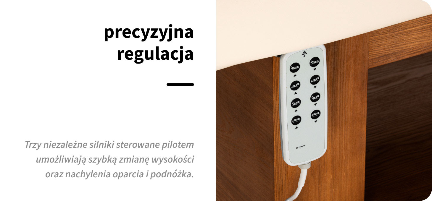Intuicyjny pilot umożliwia płynną regulację w trzech płaszczyznach – wysokości, oparcia oraz podnóżka. Regulacja wysokości w zakresie 65-90 cm pozwala dopasować ustawienie do wzrostu specjalisty i rodzaju zabiegu. Szeroki zakres regulacji ułatwia zachowanie ergonomicznej pozycji pracy – niezależnie od wzrostu specjalisty czy specyfiki procedury. Możliwość jednoczesnej regulacji oparcia i podnóżka za pomocą jednego przycisku pozwala szybko ustawić pozycję siedzącą, półleżącą lub leżącą – bez konieczności przerywania zabiegu. Płynna zmiana ustawień wspiera ergonomię pracy oraz zwiększa komfort klienta na każdym etapie procedury.