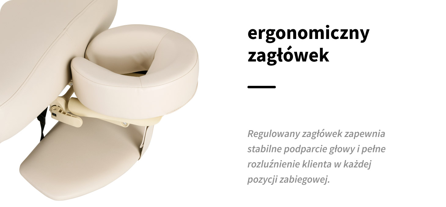 Ergonomiczny zagłówek z otworem na twarz, dołączony do zestawu, zapewnia wygodne ułożenie głowy podczas zabiegów wykonywanych na plecach, brzuchu oraz w pozycji leżącej na wznak. Odpowiednie podparcie zwiększa komfort klienta nawet podczas dłuższych procedur i sprzyja pełnemu rozluźnieniu. Element posiada regulację kąta nachylenia w dwóch płaszczyznach, co umożliwia precyzyjne dopasowanie ustawienia do rodzaju zabiegu oraz indywidualnych potrzeb.