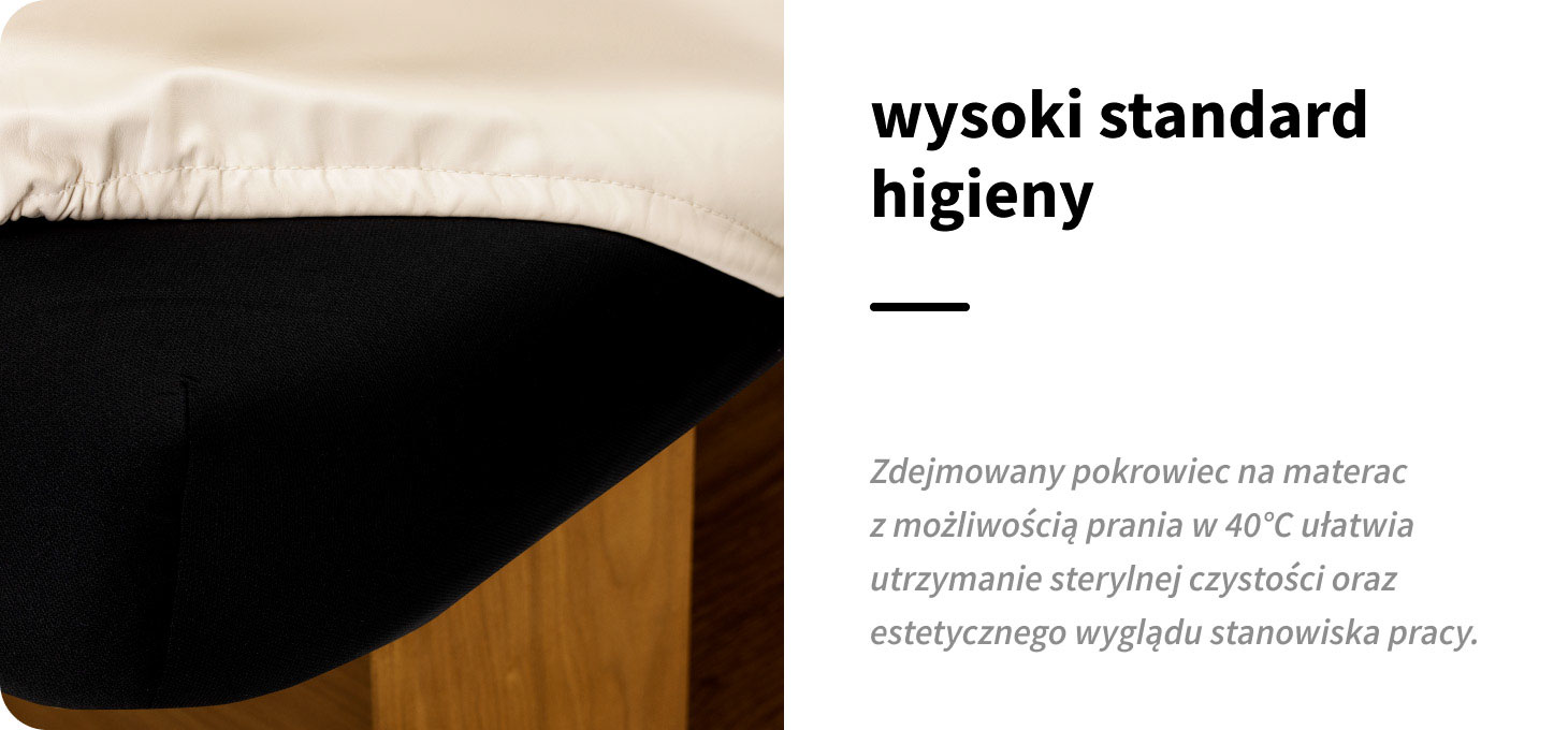 Zdejmowany pokrowiec na materac to realne ułatwienie w codziennej pracy. Możliwość szybkiego zdjęcia i wyprania (ręcznie lub w pralce do 40°C) pozwala bez trudu utrzymać wysoki standard higieny w gabinecie. Krótkie suszenie w niskiej temperaturze przyspiesza ponowne przygotowanie stanowiska do pracy. Odpowiednia pielęgnacja bez użycia alkoholu i silnych środków czyszczących pomaga zachować estetyczny wygląd oraz trwałość materiału na dłużej.