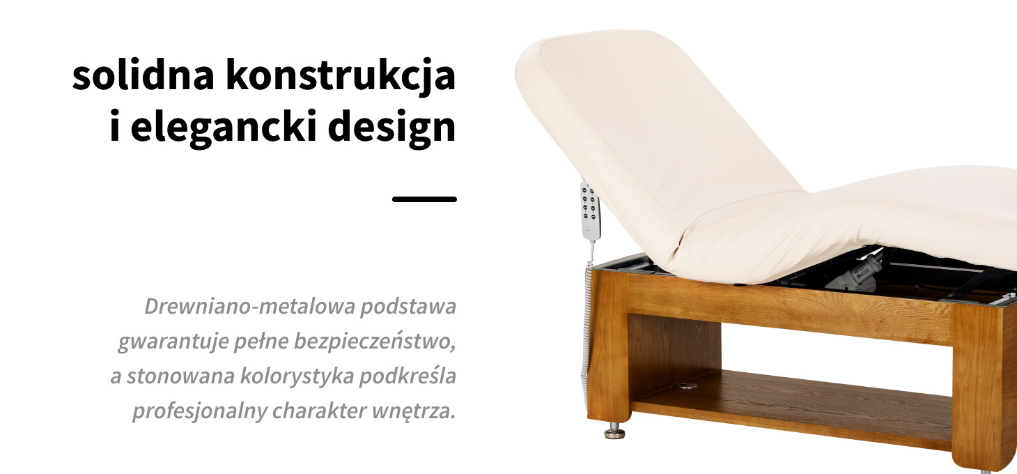 Solidna, drewniano-metalowa podstawa zapewnia wysoką stabilność i bezpieczeństwo podczas wykonywania zabiegów kosmetycznych, pielęgnacyjnych oraz masaży. Trwała konstrukcja gwarantuje pewne podparcie nawet przy intensywnej pracy, wspierając komfort zarówno klienta, jak i specjalisty. Ciepły odcień drewna w połączeniu ze stonowaną kolorystyką materaca sprawia, że leżanka wpisuje się w eleganckie wnętrza salonów masażu, gabinetów kosmetycznych i stref wellness. Starannie wykończone detale podkreślają profesjonalny charakter wyposażenia i budują spójny, estetyczny wizerunek gabinetu.