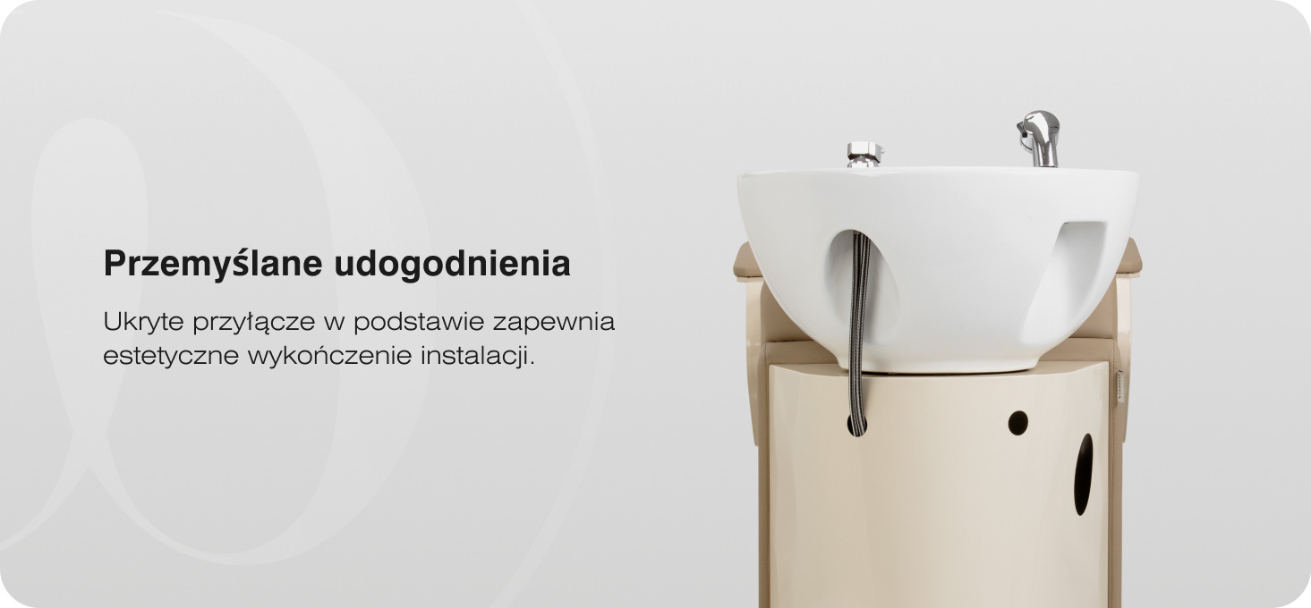 Model wyposażono w baterię z mieszaczem, zapewniającą stały dostęp do ciepłej i zimnej wody oraz wygodne dopasowanie temperatury do potrzeb klienta. Miejsce na odłożenie słuchawki natryskowej usprawnia organizację stanowiska pracy, a korek z wbudowanym sitkiem umożliwia kontrolę przepływu wody i wspiera utrzymanie higieny stanowiska. Przyłącze wody ukryte wewnątrz podstawy umożliwia estetyczne zamaskowanie instalacji, podkreślając schludny i profesjonalny wygląd myjni. Funkcjonalne rozwiązania przekładają się na sprawną i uporządkowaną codzienną pracę w salonie.