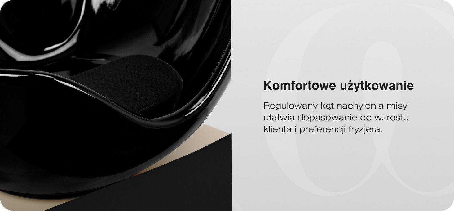 Głęboka, zaokrąglona ceramiczna misa w odcieniu bieli ogranicza rozchlapywanie wody oraz kosmetyków, wspierając utrzymanie czystości na stanowisku pracy. Trwała ceramika wyróżnia się wysoką odpornością na przebarwienia, zarysowania oraz działanie środków chemicznych. Wyprofilowany kołnierz zapewnia stabilne podparcie głowy klienta, a praktyczna podpórka w misie umożliwia wygodne ułożenie głowy. Silikonowa nakładka ogranicza odczucie chłodu, podnosząc komfort klienta podczas zabiegów.
