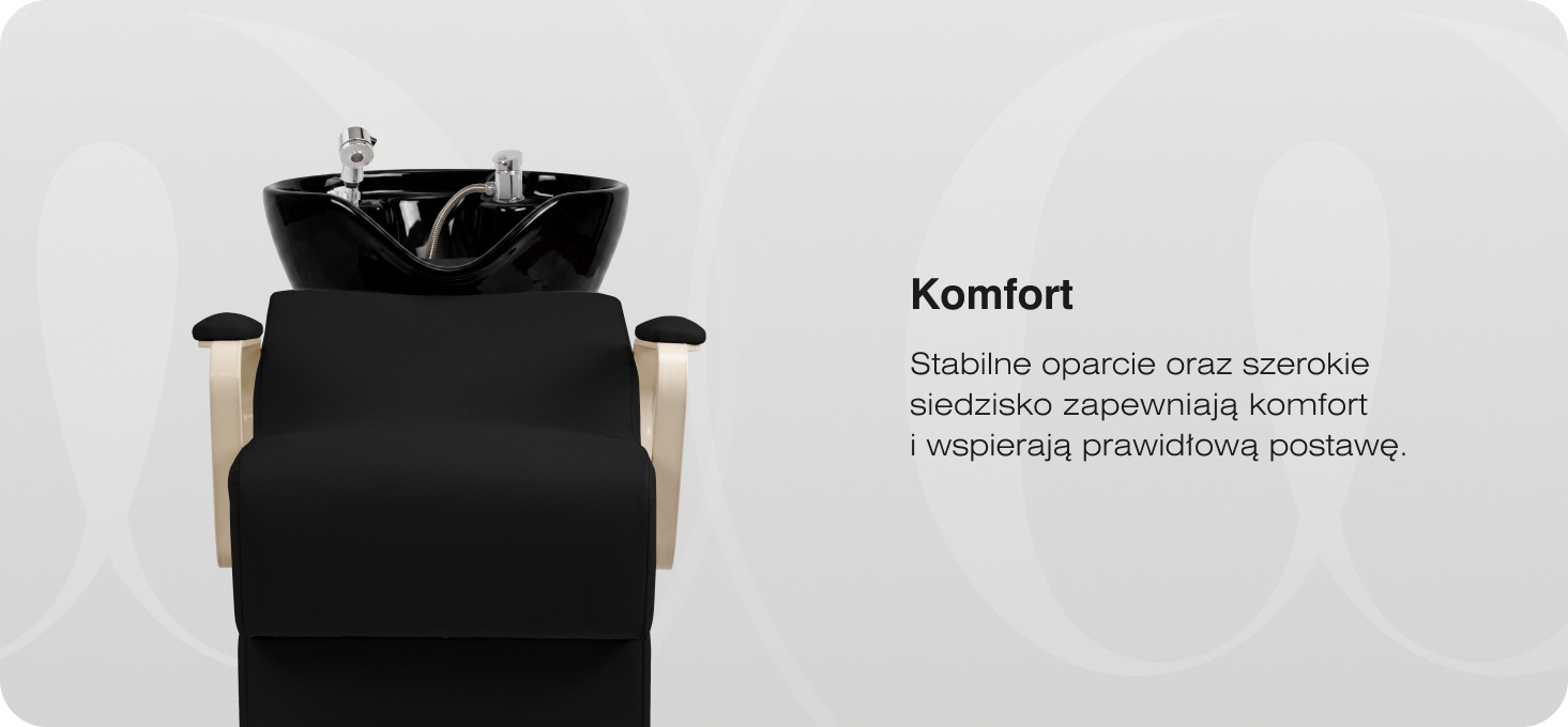 Konstrukcja o nowoczesnej formie zapewnia wygodne warunki podczas zabiegów fryzjerskich, wspierając komfort klienta nawet w trakcie dłuższych usług. Stabilne oparcie sprzyja prawidłowej pozycji ciała, a szerokie siedzisko zwiększa wygodę użytkowania. Obicie ze skóry syntetycznej w odcieniach czerni wyróżnia się odpornością na wilgoć oraz łatwością utrzymania w czystości, co sprawia, że myjnia fryzjerska doskonale sprawdza się nawet przy intensywnym użytkowaniu. Regulowana wysokość stopek umożliwia precyzyjne wypoziomowanie myjni nawet na nierównej powierzchni, zwiększając stabilność całego stanowiska. Kompletna armatura – bateria, słuchawka prysznicowa i dedykowane węże – zapewnia pełną gotowość stanowiska do pracy.