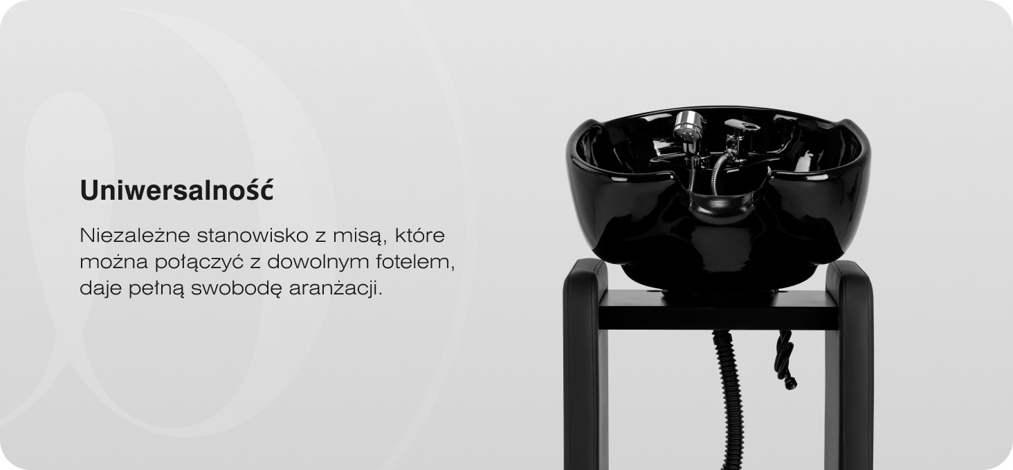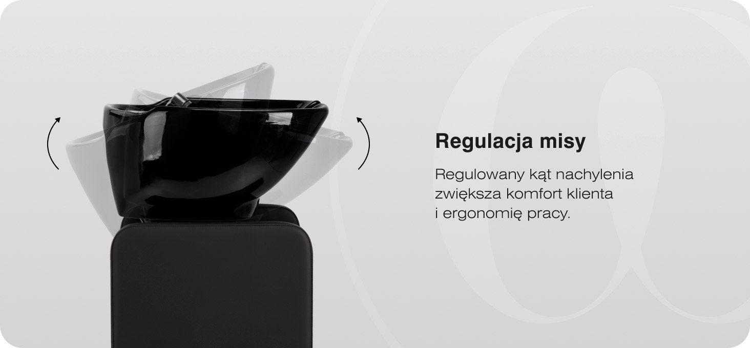 Głęboka ceramiczna misa w odcieniach czerni została zaprojektowana z myślą o wygodnym wykonywaniu zabiegów mycia i pielęgnacji włosów. Odpowiednio wyprofilowany kształt ogranicza rozchlapywanie wody oraz kosmetyków, pomagając utrzymać czystość wokół stanowiska pracy. Regulowany kąt nachylenia umożliwia dopasowanie jej ustawienia do wzrostu klienta oraz preferencji fryzjera, zwiększając ergonomię wykonywanych usług. Trwały materiał misy wykazuje wysoką odporność na działanie wilgoci, temperatury oraz środków fryzjerskich, a gładka powierzchnia sprzyja utrzymaniu higieny. Nakładka z tworzywa sztucznego eliminuje uczucie chłodu przy kontakcie z ceramiką.