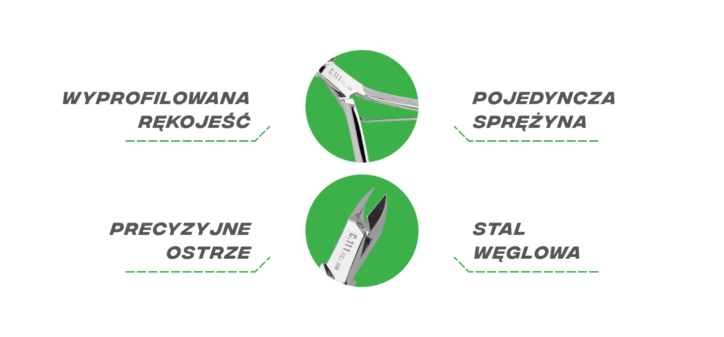 Pojedyncza sprężyna łączy ramiona cążek, zapewniając wyczucie oraz precyzję cięcia. Staranne jej wykonanie pozwala na komfortową pracę. Sposób wyprofilowania oraz wielkość ramion sprawiają, że cążki stabilnie leżą w dłoni, gwarantując wygodę użytkowania. Polerowane wykończenie sprawia, że prezentują się elegancko, a chromowana powierzchnia zwiększa ich odporność oraz ułatwia utrzymanie w czystości. Czyni je to idealnym narzędziem zarówno dla profesjonalistów, jak i podczas pielęgnacji paznokci w warunkach domowych.