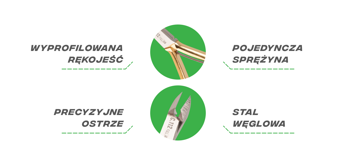 Pojedyncza sprężyna łączy ramiona cążek, zapewniając wyczucie oraz precyzję cięcia. Staranne jej wykonanie pozwala na komfortową pracę. Sposób wyprofilowania oraz wielkość ramion sprawiają, że cążki stabilnie leżą w dłoni, gwarantując wygodę użytkowania. Polerowane wykończenie w odcieniach złota sprawia, że prezentują się elegancko, a jednocześnie narzędzie jest trwałe oraz łatwe do utrzymania w czystości. Czyni je to idealnym narzędziem zarówno dla profesjonalistów, jak i podczas pielęgnacji paznokci w warunkach domowych.