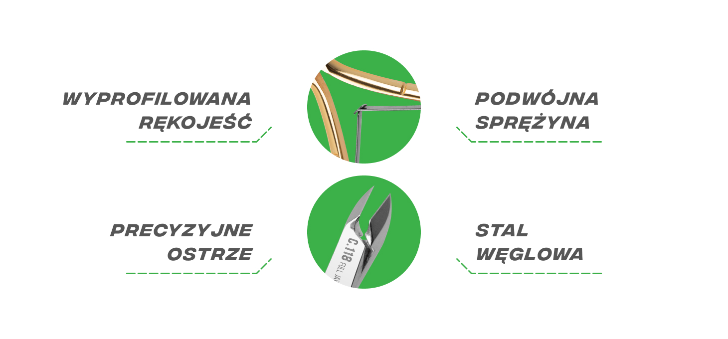 Podwójna sprężyna łączy ramiona cążek, zapewniając wyczucie oraz precyzję cięcia. Staranne jej wykonanie pozwala na komfortową pracę. Sposób wyprofilowania oraz wielkość ramion sprawiają, że cążki stabilnie leżą w dłoni, gwarantując wygodę użytkowania. Polerowane wykończenie w odcieniach złota sprawia, że prezentują się elegancko, a jednocześnie narzędzie jest trwałe oraz łatwe do utrzymania w czystości. Czyni je to idealnym narzędziem zarówno dla profesjonalistów, jak i podczas pielęgnacji paznokci w warunkach domowych.