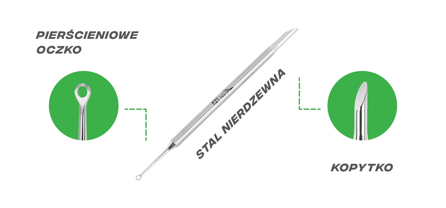 • Pierścieniowe oczko z kolei sprawdzi się doskonale podczas usuwania skórek z płytki paznokcia i wałów okołopaznokciowych.