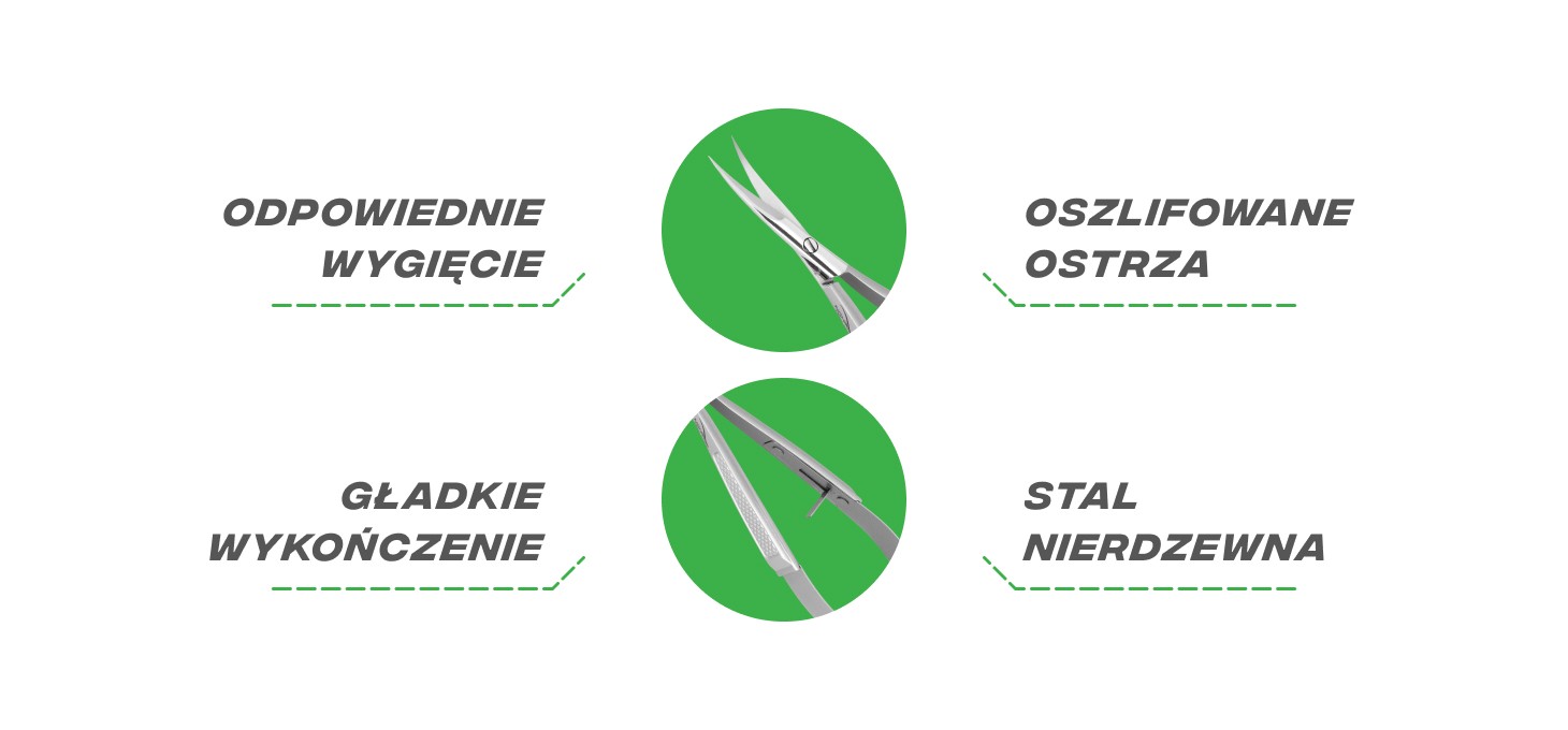 Wydłużone rękojeści z antypoślizgowymi elementami wspierają naturalny układ dłoni, zwiększając komfort podczas długotrwałej pracy. Nożyczki wykonano z wysokiej jakości stali nierdzewnej, dzięki czemu charakteryzują się wyjątkową trwałością oraz odpornością na uszkodzenia i stępienie. Są w pełni przystosowane do sterylizacji w autoklawie. Wykończenie ułatwia utrzymanie narzędzia w czystości, co jest kluczowe w zachowaniu najwyższych standardów higieny. Dodatkowym atutem jest elastyczna osłonka na ostrza, która po zakończeniu pracy utrzymuje je złączone. Dzięki temu nożyczki można bezpiecznie przechowywać, jednocześnie chroniąc ostrza przed uszkodzeniem i stępieniem.