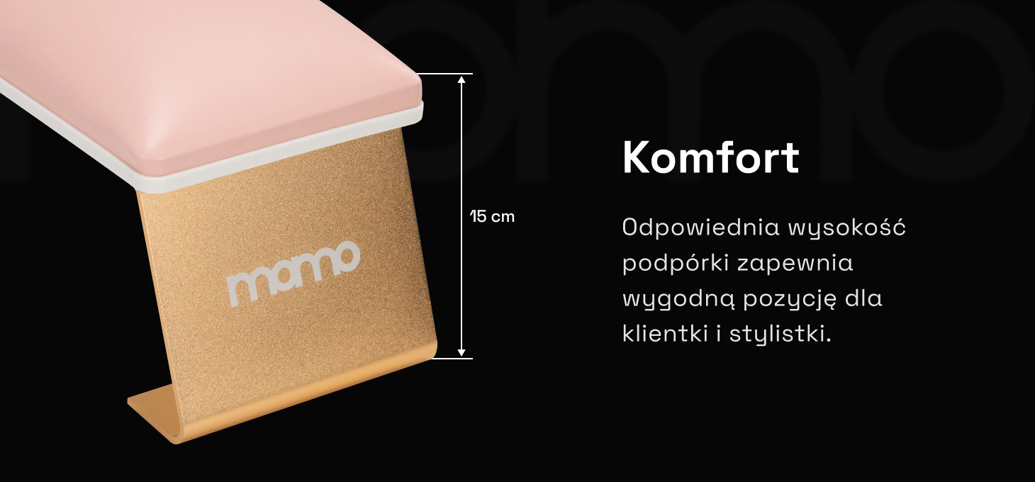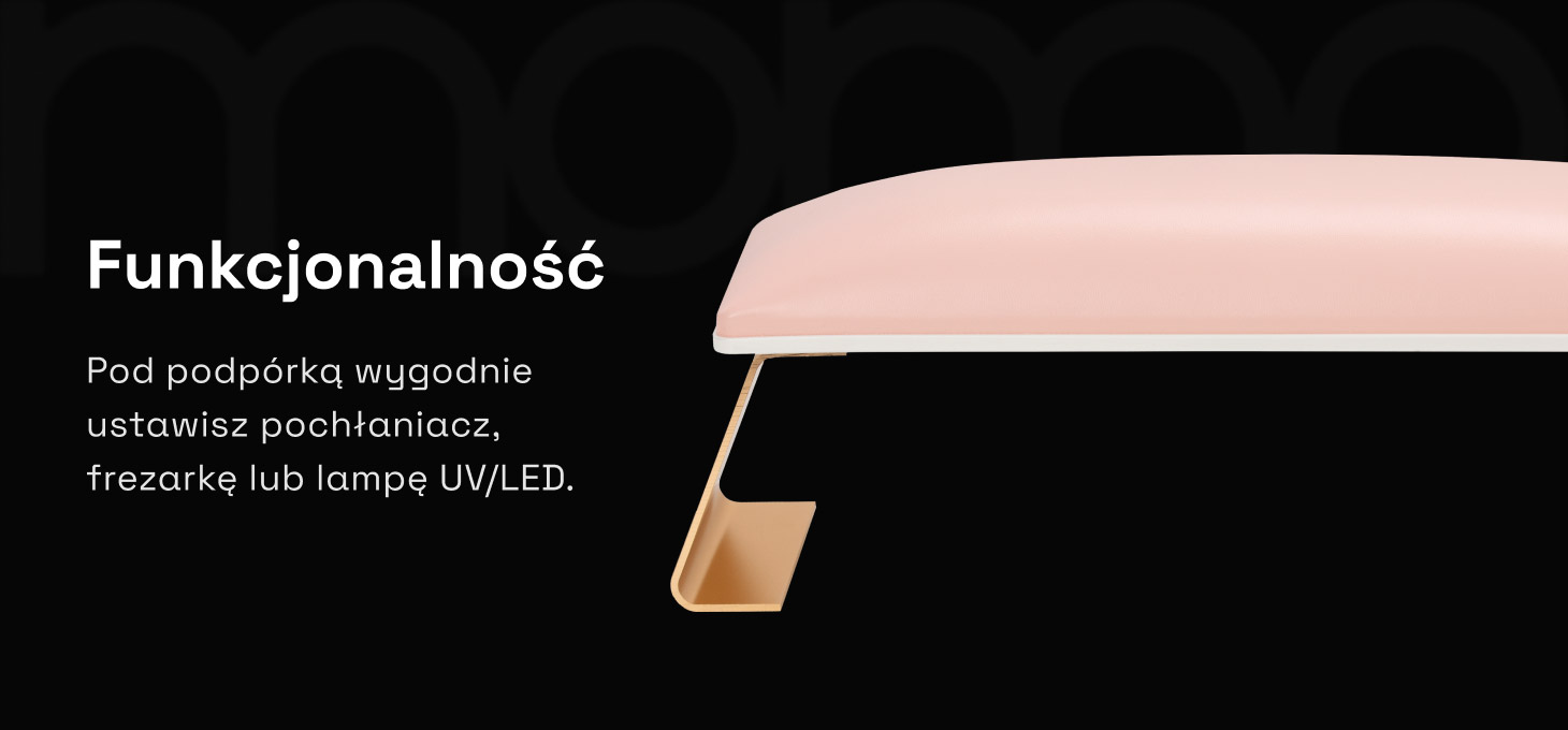 Podpórka do manicure Momo 7-M to niezbędny element wyposażenia salonu stylizacji paznokci, który znacząco poprawia wygodę pracy stylistki oraz komfort klientki. Dzięki odpowiednim wymiarom umożliwia wygodne umieszczenie pod nią niezbędnych urządzeń, takich jak pochłaniacz pyłu, frezarka czy lampa UV/LED. Takie rozwiązanie ułatwia organizację stanowiska pracy i poprawia jego ergonomię.