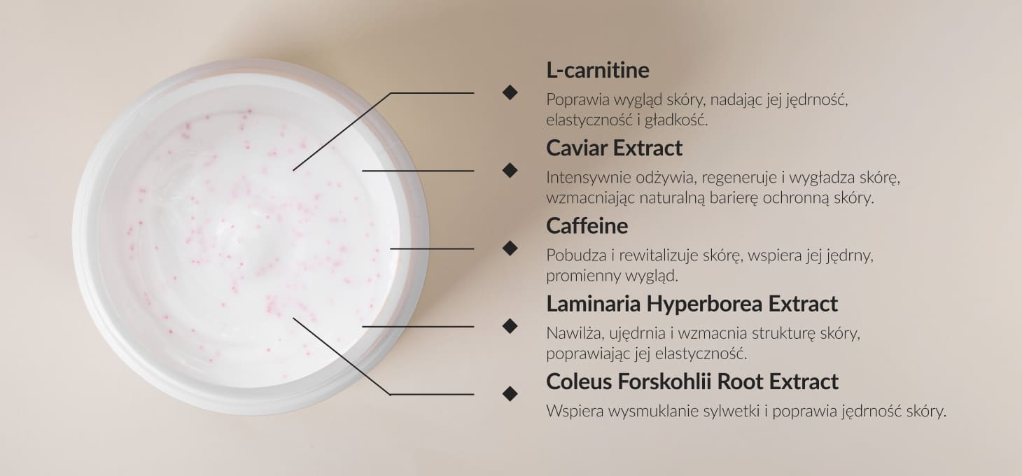 Formułę balsamu wzbogacono o składniki o wysokiej aktywności, które wspierają nawilżenie, ujędrnienie i odżywienie skóry. L-karnityna poprawia jędrność i gładkość skóry, kofeina działa rewitalizująco i wspiera poprawę jędrności, a ekstrakt z kawioru intensywnie odżywia i wygładza naskórek. Ekstrakt z alg Laminaria Hyperborea nawilża, wzmacnia i uelastycznia skórę, a ekstrakt z korzenia pokrzywy indyjskiej wspomaga modelowanie sylwetki, nadając skórze jędrny i zdrowy wygląd.