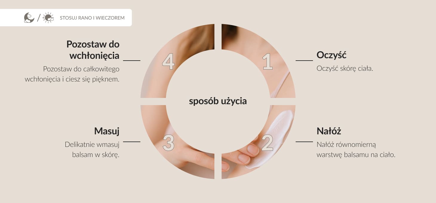 Nałożyć balsam na oczyszczoną skórę ciała i delikatnie wmasować. Pozostawić do całkowitego wchłonięcia. Produkt nie wymaga spłukiwania.