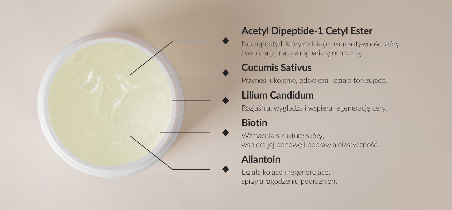 Formułę żelu została wzbogacona o substancje łagodzące i wyciszające, które zwiększają komfort skóry podczas profesjonalnych zabiegów. Neuropeptyd Acetyl Dipeptide-1 Cetyl Ester ogranicza nadreaktywność skóry i wspiera jej naturalną barierę ochronną. Ekstrakt z ogórka działa odświeżająco i łagodząco, a biała lilia wygładza i wspomaga regenerację cery. Biotyna wzmacnia strukturę skóry oraz poprawia jej elastyczność, natomiast alantoina działa kojąco i regenerująco, sprzyjając łagodzeniu podrażnień.