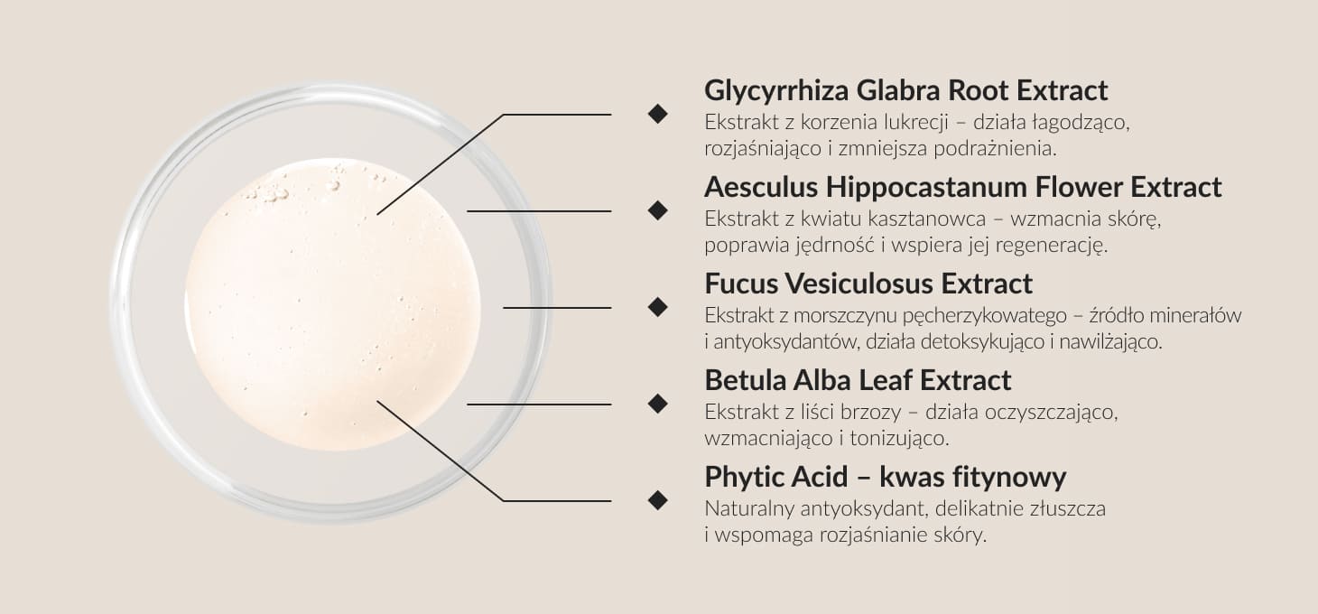 Ekstrakt z liści brzozy wspiera naturalne procesy oczyszczania, działa tonizująco i wzmacniająco. Kwas fitynowy delikatnie wygładza i reguluje wydzielanie sebum, przywracając komfort i zdrowy wygląd cery.