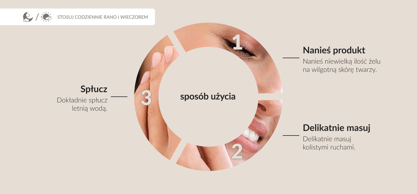 Nanieś niewielką ilość żelu na wilgotną skórę twarzy. Delikatnie masuj kolistymi ruchami, a następnie dokładnie spłucz letnią wodą.