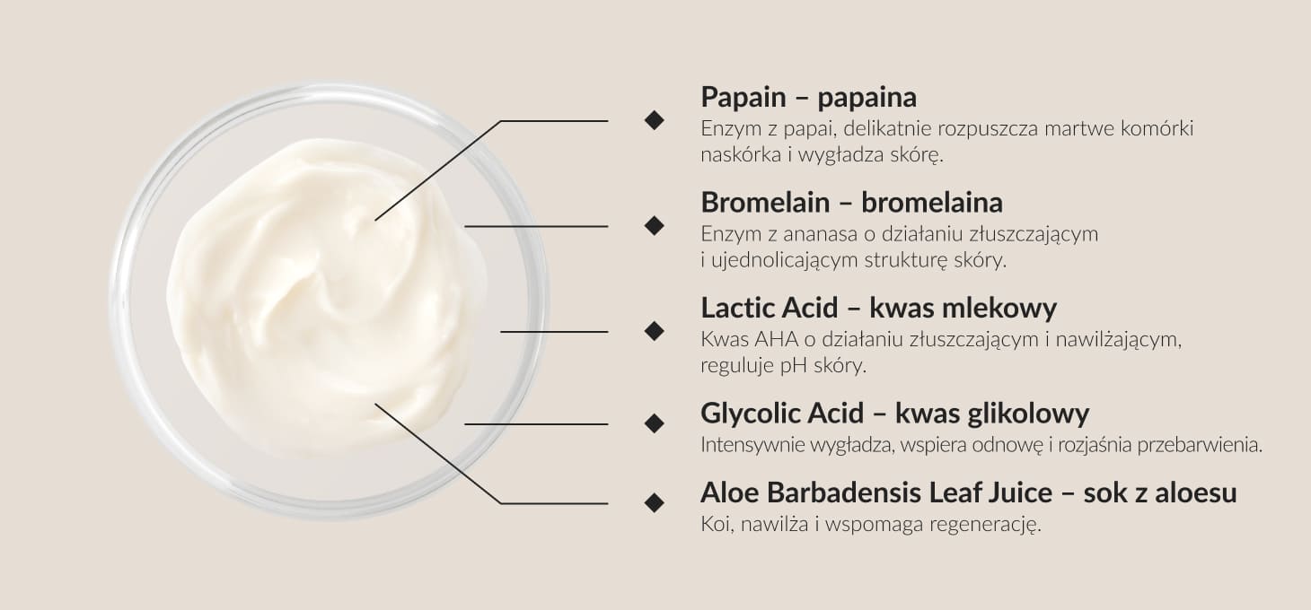 Papaina i bromelaina delikatnie rozpuszczają zrogowaciały naskórek, wspomagając naturalne procesy odnowy. Kwas mlekowy i glikolowy z grupy AHA wygładzają i rozjaśniają cerę, poprawiając jej strukturę i koloryt. Ekstrakty z jabłka, owsa, marakui, szałwii muszkatołowej oraz sok z aloesu dostarczają skórze cennych antyoksydantów i łagodzą podrażnienia.