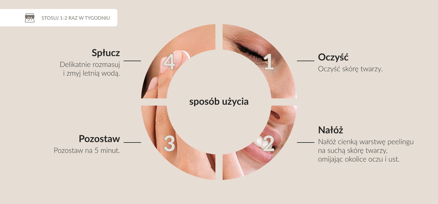 Nałóż cienką warstwę peelingu na oczyszczoną, suchą skórę twarzy, omijając okolice oczu i ust. Pozostaw na 5 minut, następnie delikatnie rozmasuj i dokładnie zmyj letnią wodą. Stosuj 1–2 razy w tygodniu lub według potrzeb skóry.