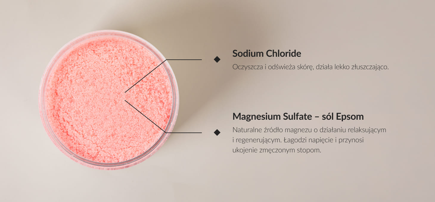 Skład (INCI): Sodium Chloride, Magnesium Sulfate, Parfum, Aqua, CI 14700.