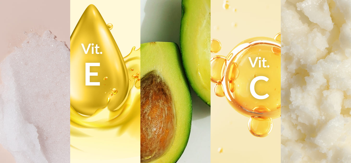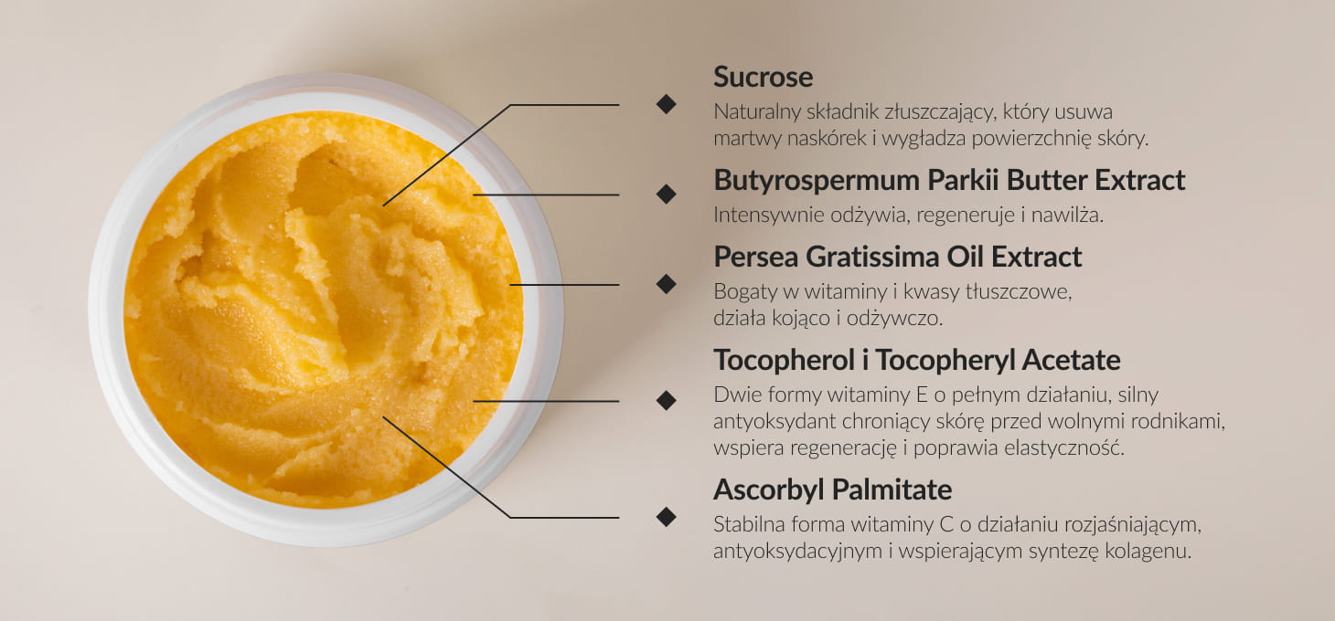 Formułę peelingu wzbogacono o składniki łączące działanie złuszczające i odżywcze. Kryształki cukru delikatnie usuwają martwy naskórek, prowadząc do wygładzenia skóry. Masło shea intensywnie odżywia i nawilża skórę, a olej z awokado dostarcza witamin i kwasów tłuszczowych, działając kojąco. Witaminy E oraz C pełnią funkcję antyoksydantów, pomagając chronić skórę przed stresem oksydacyjnym.
