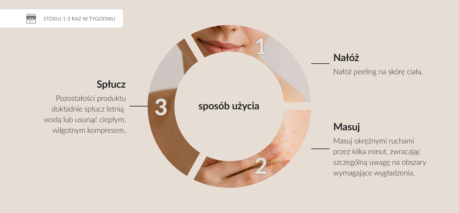 Nałożyć peeling na skórę ciała i masować okrężnymi ruchami przez kilka minut, zwracając szczególną uwagę na obszary wymagające wygładzenia. Pozostałości produktu dokładnie spłukać letnią wodą lub usunąć ciepłym, wilgotnym kompresem.