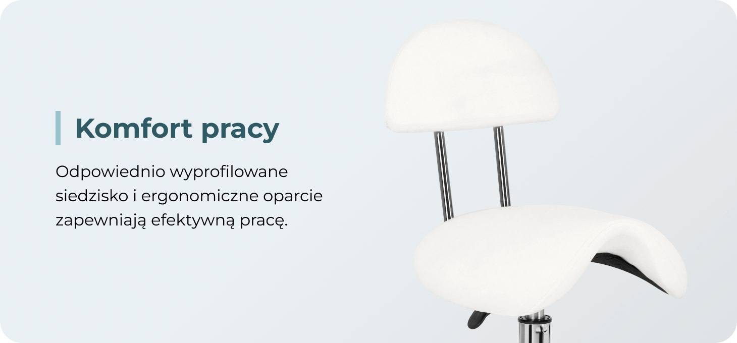 Możliwość regulacji wysokości siedziska w zakresie 49-62 cm ułatwia specjaliście odpowiednie ułożenie ciała w trakcie wykonywania usług. Siedzisko wyprofilowane na kształt siodła wypełnione trwałą, odporną na odkształcenia pianką gwarantuje użytkownikom wygodę oraz ergonomię pracy. Komfortowe oparcie zapewnia doskonałe wsparcie pleców, niezależnie od wzrostu użytkownika. Mechanizm pełnego obrotu sprawia, że praca staje się bardziej efektywna i wygodna.