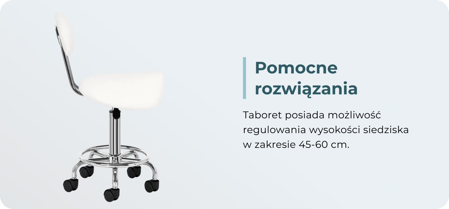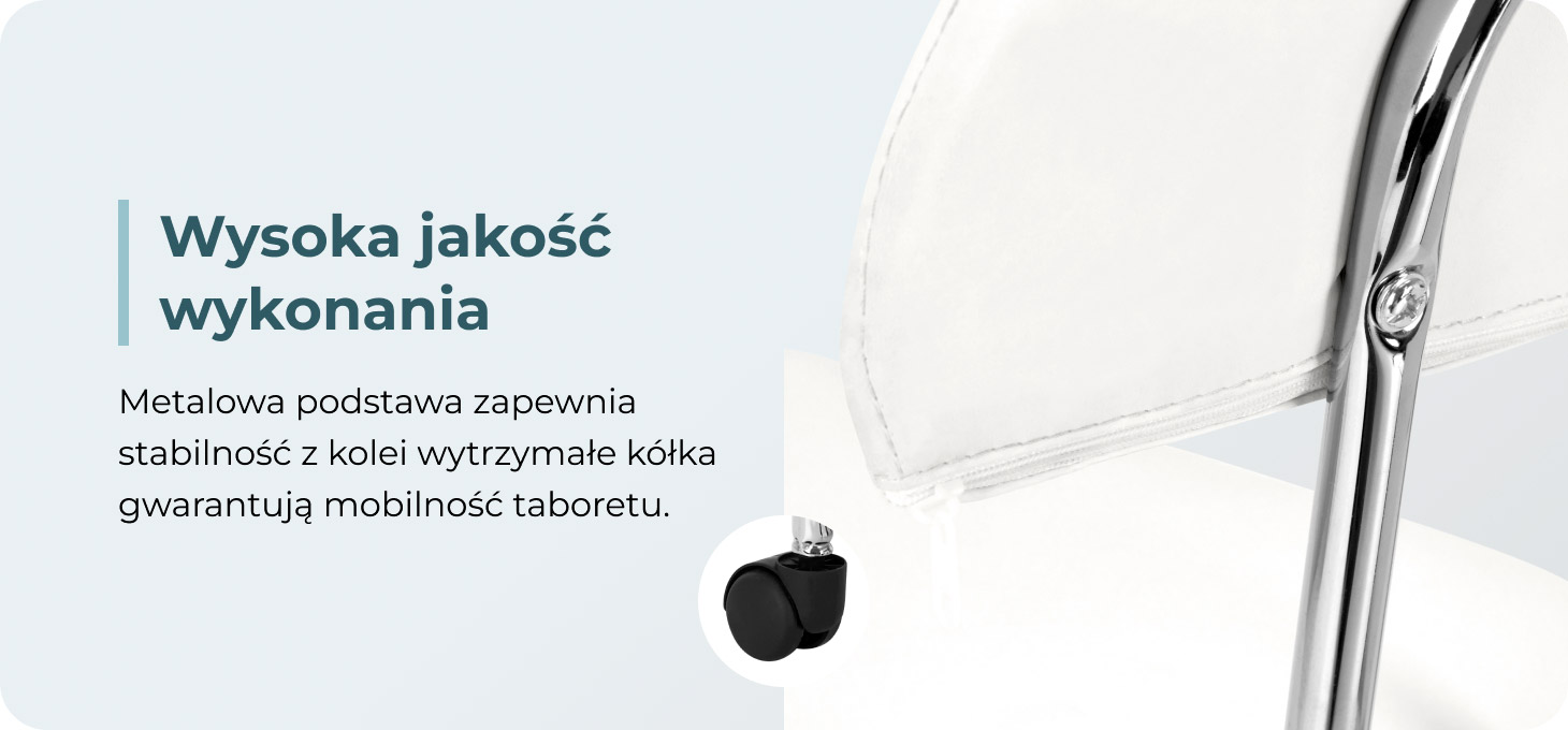 Pięcioramienna podstawa w odcieniach chromu wyposażona jest w kółka, które zapewniają znaczną mobilność, ułatwiając łatwe przemieszczanie mebla po gabinecie. Obicie taboretu wykonano z przyjemnej w dotyku imitacji skóry w odcieniach bieli. Dzięki użyciu takiego materiału taboret jest trwały, odporny na wilgoć i łatwy w czyszczeniu.